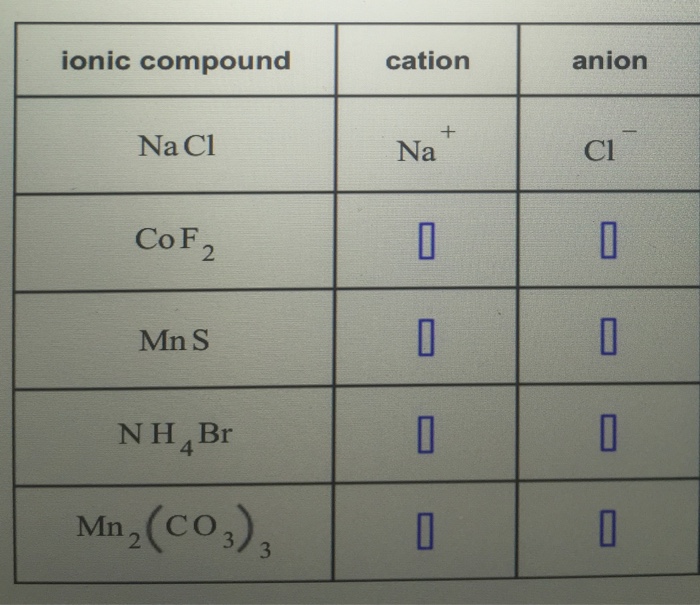 Then the cation and anion are attracted to each other because they have opposite charges. See examples of the two types of ions, learn how they are different, and see periodic table trends. An anion is an ion that is negatively charged, and is attracted to the anode (positive elect. Ions result from atoms or molecules that have gained or lost one or more valence electrons, giving them a positive or negative charge. Mnbr2 is composed of the cation mn2+ and the anion br1 mnf2.f anion. Then write correct formula in the corresponding box in the table above. When writing the formula of a compound, the cation is listed before the anion. An ion is an atom or group of atoms in which the number of electrons is not equal to the number of protons, giving it a net positive or negative electrical charge. Week 2 cations and anions reaction. Halogens always form anions, alkali metals and alkaline earth metals always form cations. The word anion in greek means 'up,' which could be related to the increase in the number of electrons within the element. Like many monoxides, mno adopts the rock salt structure, where cations and anions are both octahedrally coordinated. X and symbolize the anion and cation of the acid and base, where mx is an indifferent electrolyte.